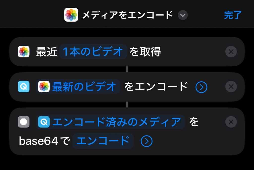 アクションを検索に64と入力し「base64エンコード」を選択する。これで音源をテキスト化できました。