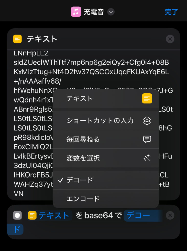 アクションを検索に64と入力し「base64エンコード」を選択しエンコードをタップしてデコードに変更する。