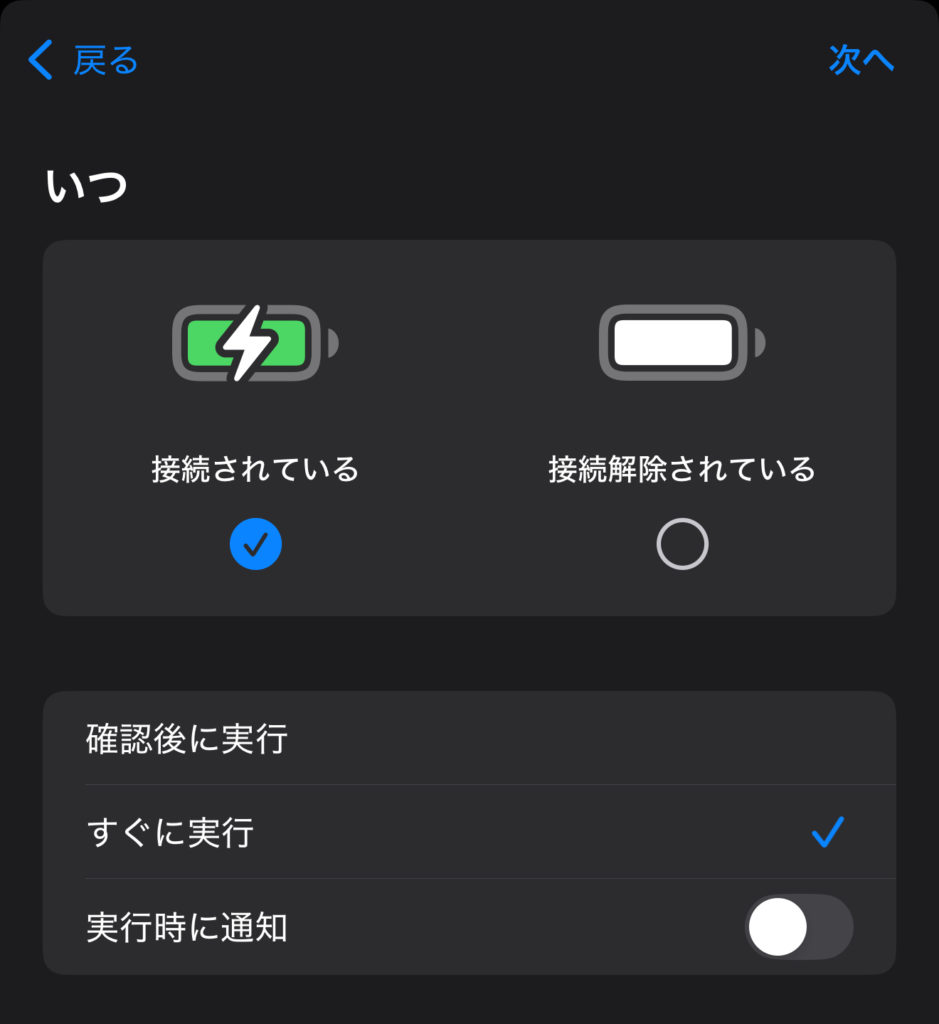 オートメーションから個人用オートメーションを選択する。アクションを検索に充電と入力し「充電器」を選択し、今回は充電音なので接続されているを選ぶ、すぐに実行にもチェックし次へをタップ。